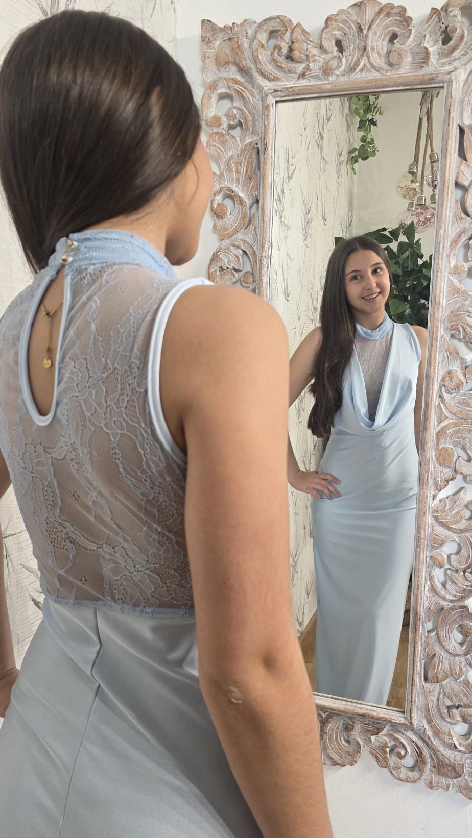 39.00€El elegante vestido Alicia tiene un diseño sofisticado y moderno. La parte superior destaca por su escote en forma de “v” profundo, que está adornado con un delicado detalle de tela traslúcida de encaje.