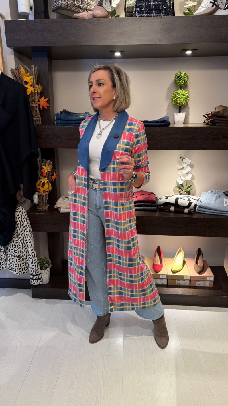 Presenta un estampado de cuadros en varios tonos cálidos y suaves, perfectamente combinados para aportar luz y personalidad al look. Su corte recto y largo midi estiliza la silueta, mientras que el cuello tipo solapa abierta le da un acabado elegante y desenfadado a la vez.