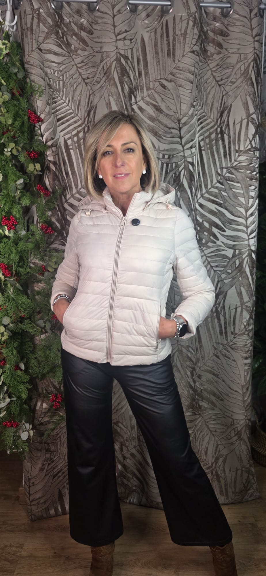 El abrigo Mikaela presenta un diseño ligero y moderno, ideal para los días frescos sin necesidad de llevar una prenda demasiado voluminosa. Está confeccionado en un tejido acolchado de acabado mate. Su confección en franjas horizontales distribuye homogéneamente el relleno, garantizando comodidad y un ajuste favorecedor.