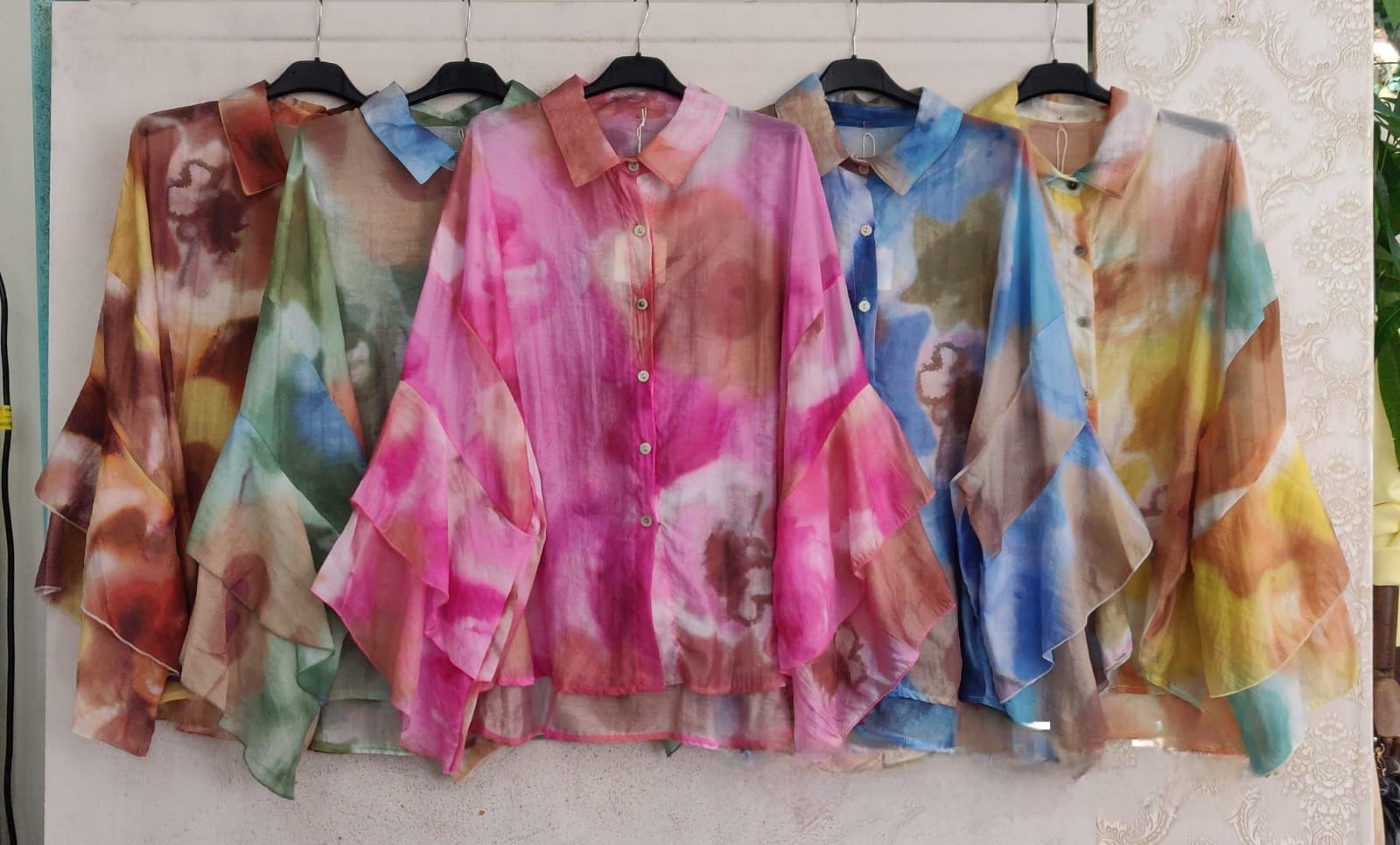 La Blusa Cecilia fluida con estampado efecto acuarela en tonos vibrantes que aportan luz y originalidad a cualquier look. Diseñada con cuello camisero y cierre frontal de botones, destaca por sus mangas amplias con caída ligera que le dan un aire elegante y muy favorecedor. Su tejido ligero y suave la hace perfecta para llevar con comodidad durante todo el día.