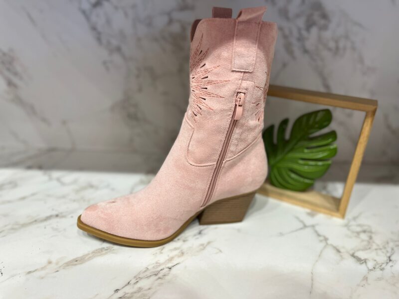 El botín cowboy Talía presenta un estilo moderno con inspiración western. Está confeccionado en un tono rosa empolvado, de acabado aterciopelado que transmite suavidad y feminidad.