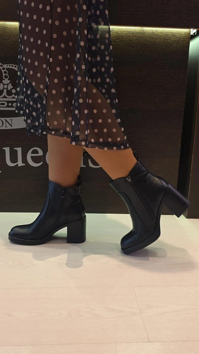 El botín Rosalen de tacón medio, de unos 8cm aproximadamente, y ancho destaca por su diseño moderno y versátil. Confeccionado efecto piel, presenta una silueta elegante que combina comodidad y estilo. La parte trasera cuenta con una trabilla que facilita el calce, mientras que en los laterales incorpora dos cremalleras: la interior, que es la funcional y permite abrir y cerrar el botín con facilidad, y la exterior, que actúa únicamente como detalle decorativo, aportando un toque sofisticado y urbano.
