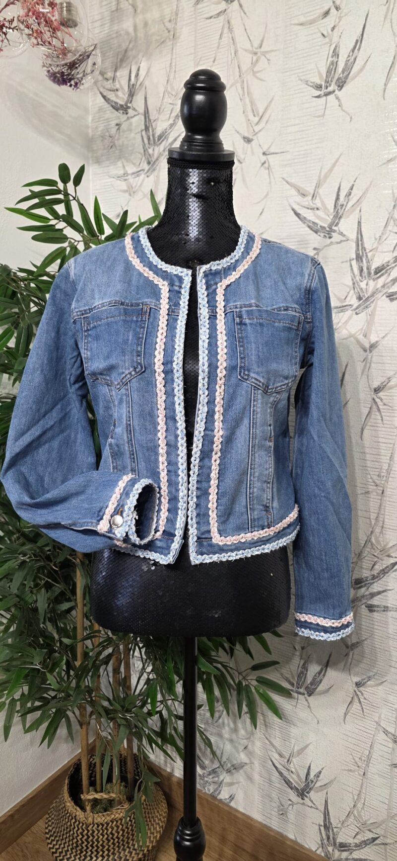 El elemento más distintivo es el ribete decorativo que recorre los bordes de la prenda: una pasamanería de encaje en tonos pastel, con combinaciones de azul bebé y rosa empolvado. Este adorno aparece en el contorno del cuello redondo, la abertura frontal, los puños y el bajo, creando un contraste encantador con el tejido vaquero y aportando un toque chic y dulce.