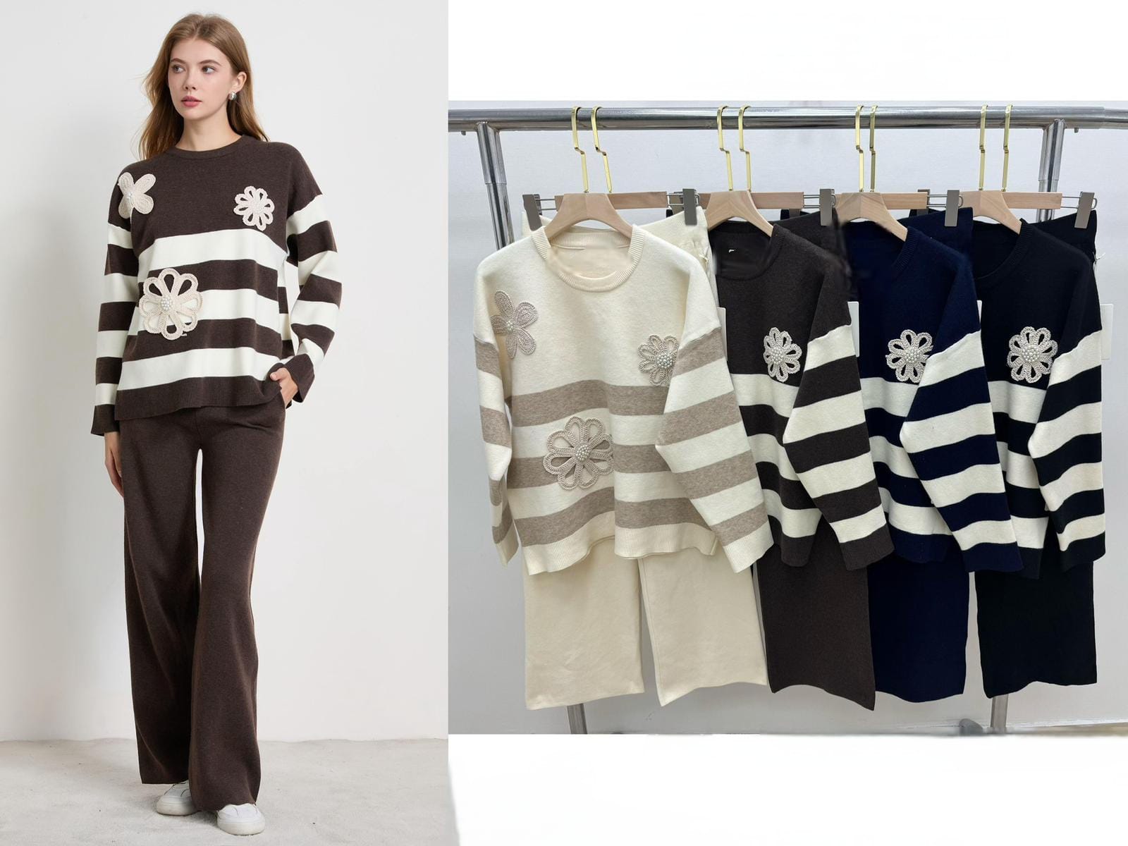 El conjunto Flor de Loto combina comodidad y estilo con un aire moderno y femenino. La parte superior es un jersey de punto con amplias franjas horizontales, adornado con grandes con flores de crochet con unas perlitas.