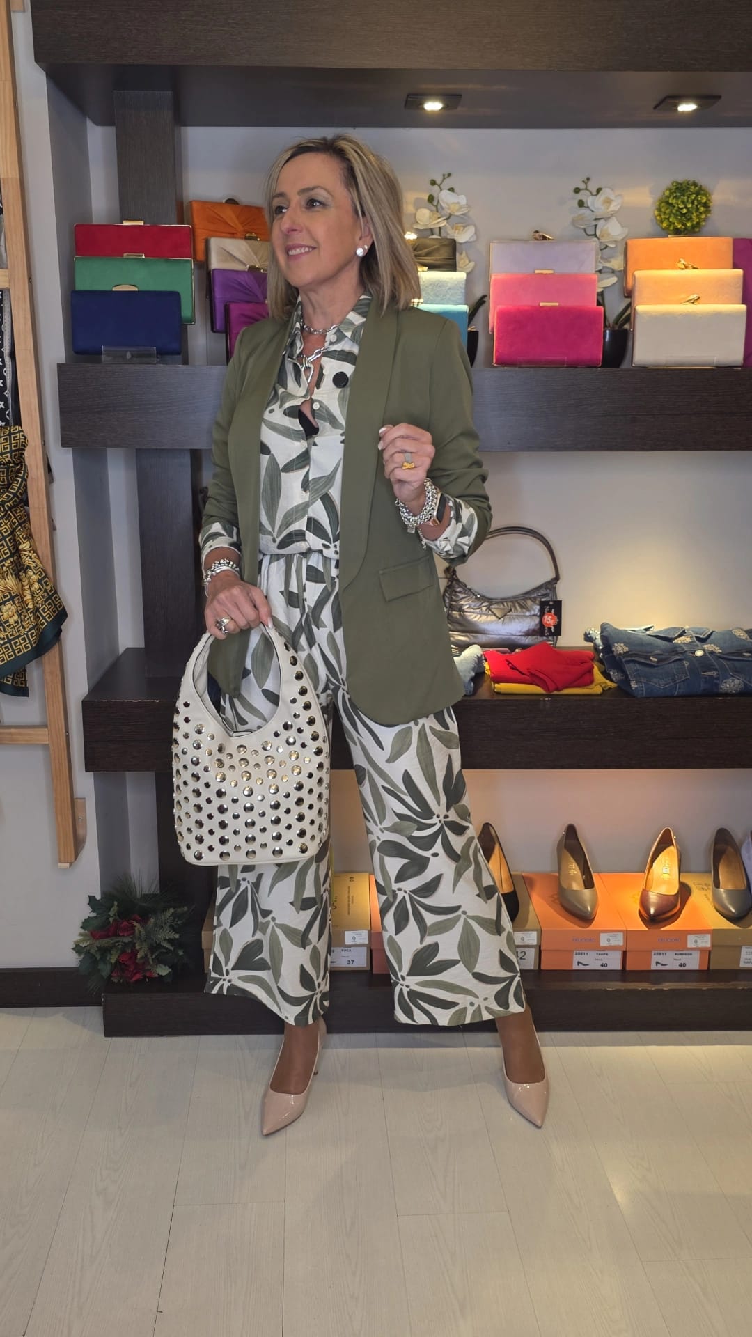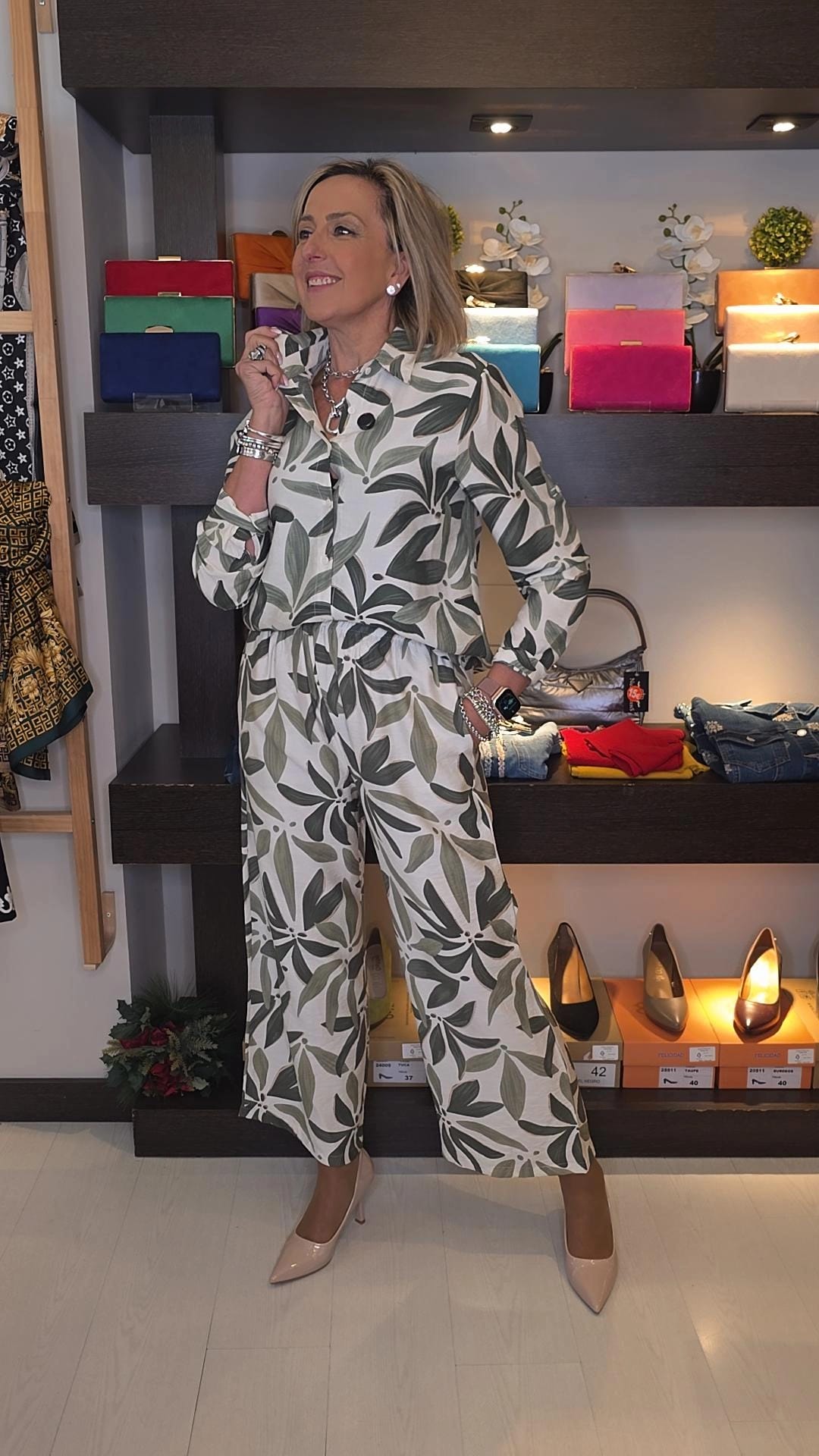 El conjunto Hojas es elegante y con un estilo contemporáneo a través de un conjunto estampado. Está compuesto por una blusa tipo  de corte largo y manga larga que se puede recoger añadiendo un toque fresco y desenfadado, ideal para los días más templados o para eventos en los que se busca comodidad sin perder sofisticación.