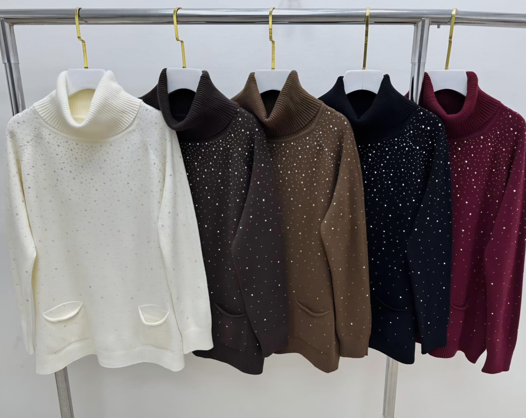 La prenda destaca por los pequeños brillantes distribuidos de forma delicada por la parte frontal, que añaden un toque de luz y feminidad sin resultar excesivos. Las mangas largas y el corte relajado ofrecen una sensación de confort, mientras que los dos bolsillos frontales —discretos y prácticos— completan el diseño. Talla única, ideal de una 38-46