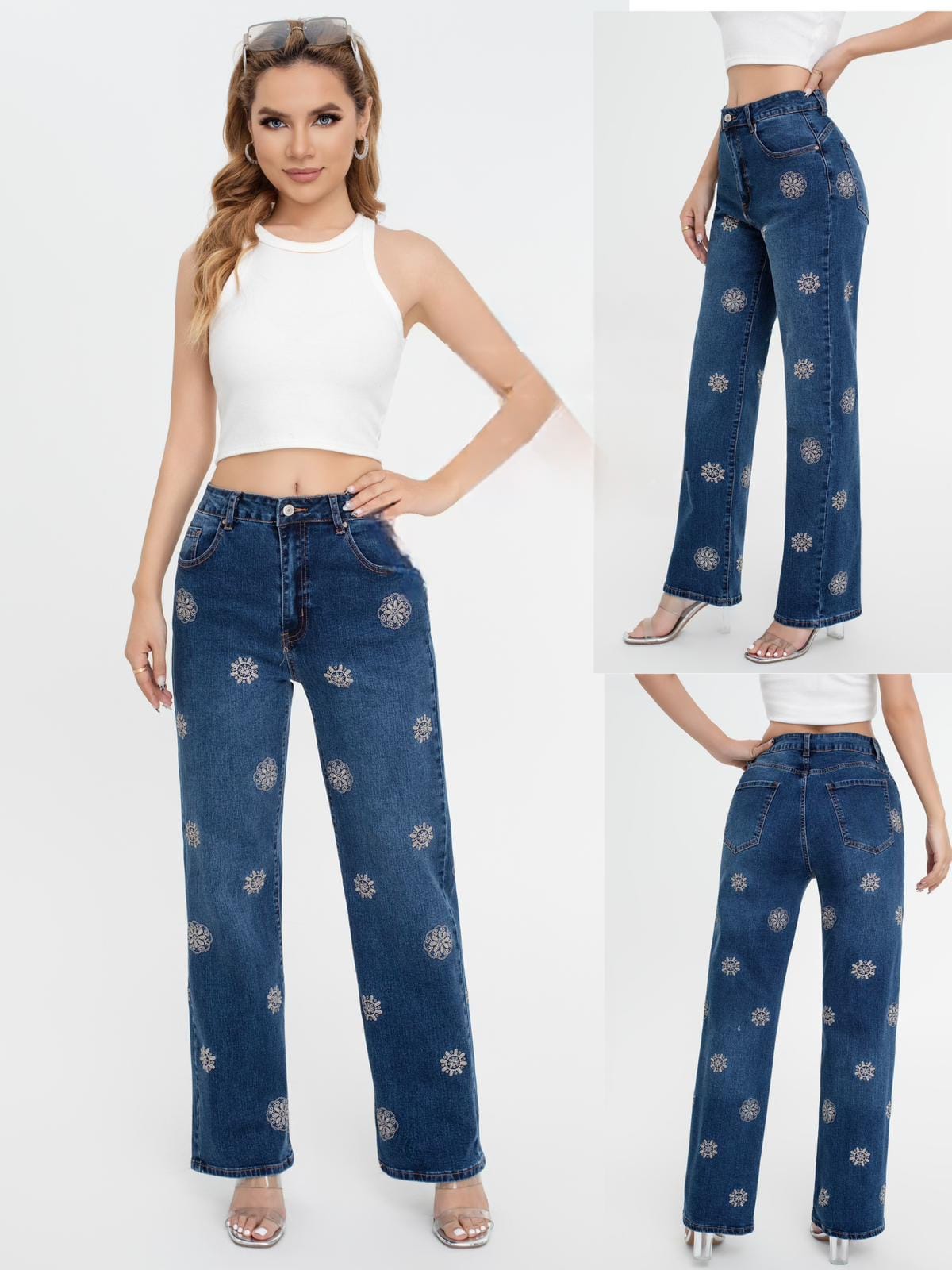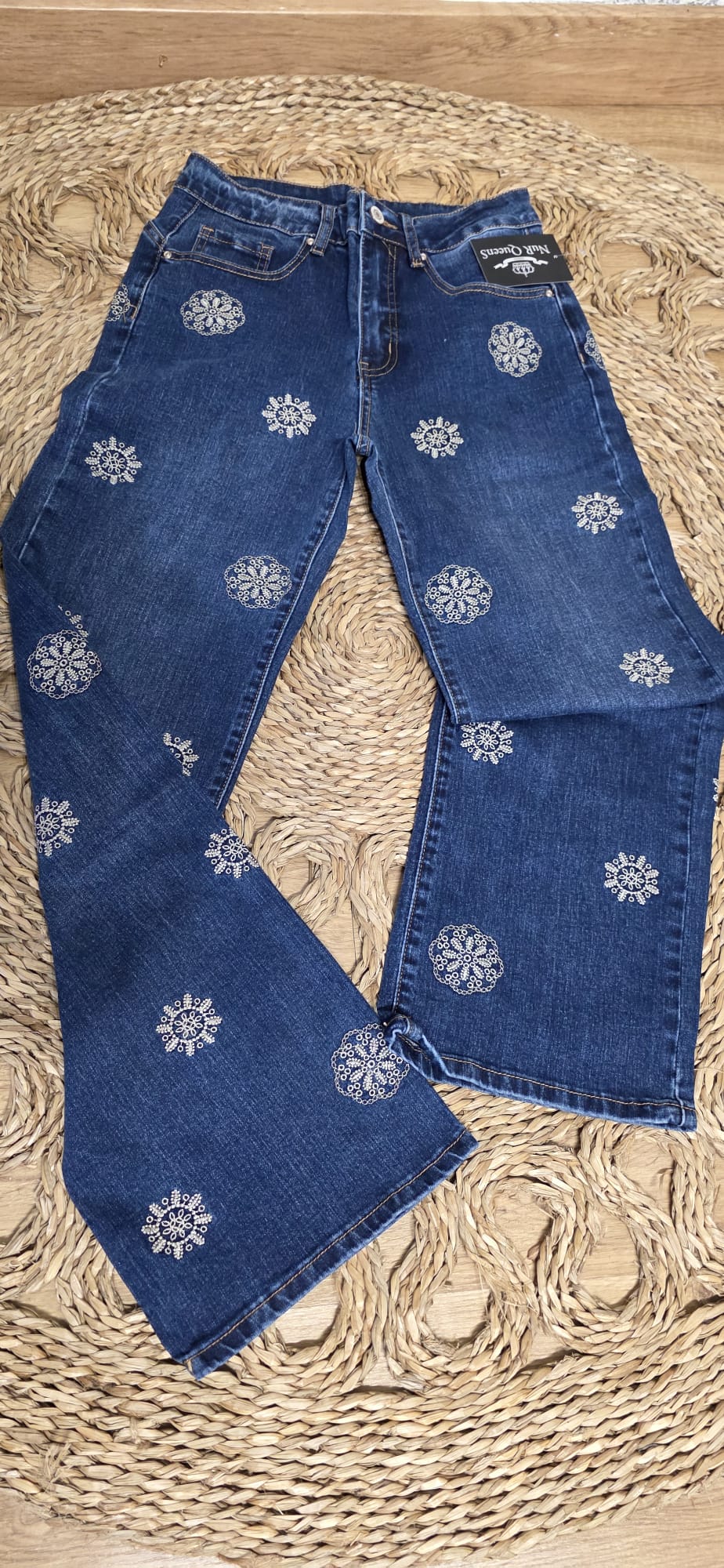 Como un detalle distintivo, está decorada con bordados y lentejuelas que forman motivos circulares de inspiración mandala, se distribuyen de manera uniforme por toda la superficie, tanto en la parte frontal como en la trasera, añaden un matiz bohemio y creativo, rompiendo con la sobriedad del denim liso.