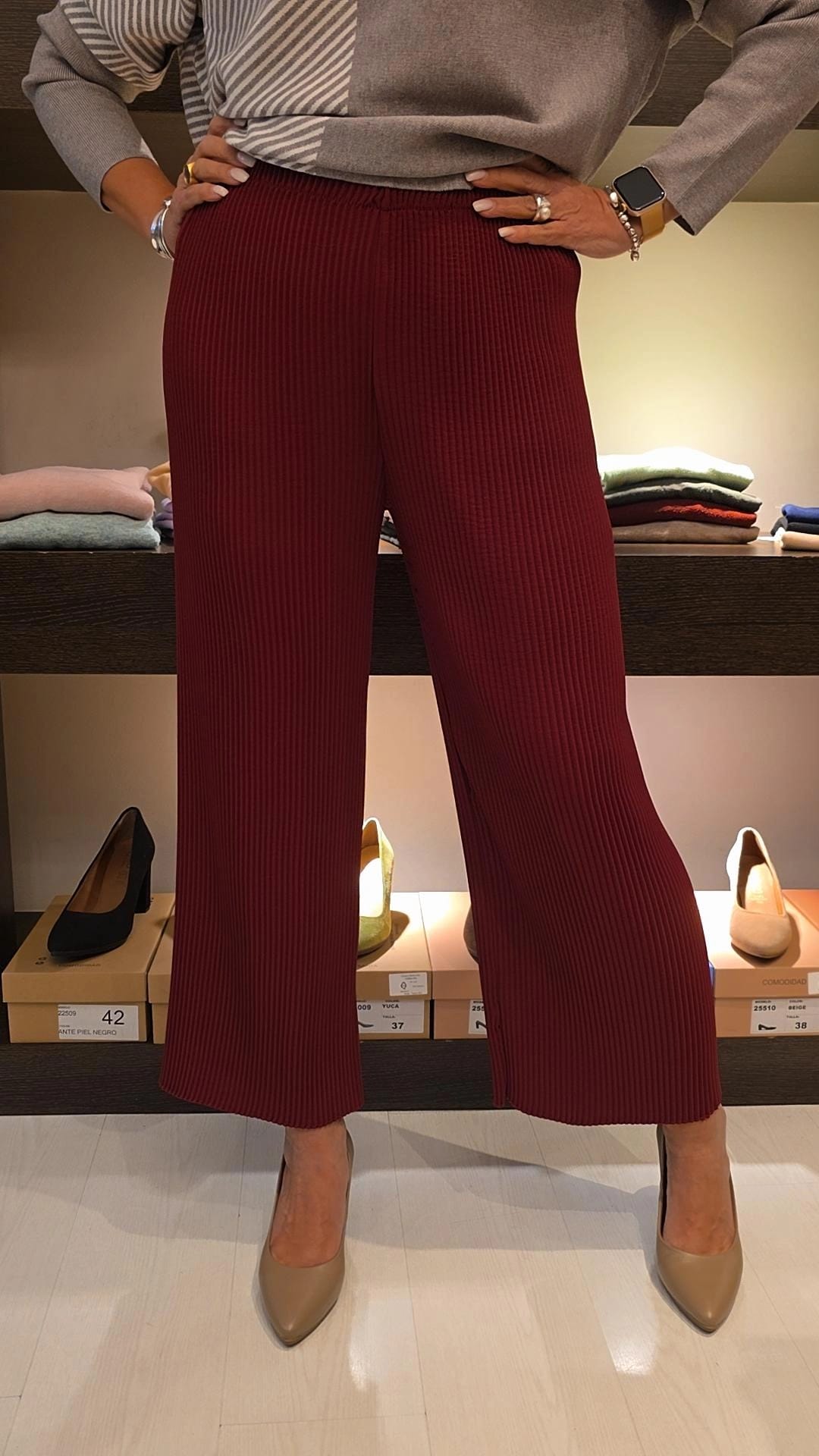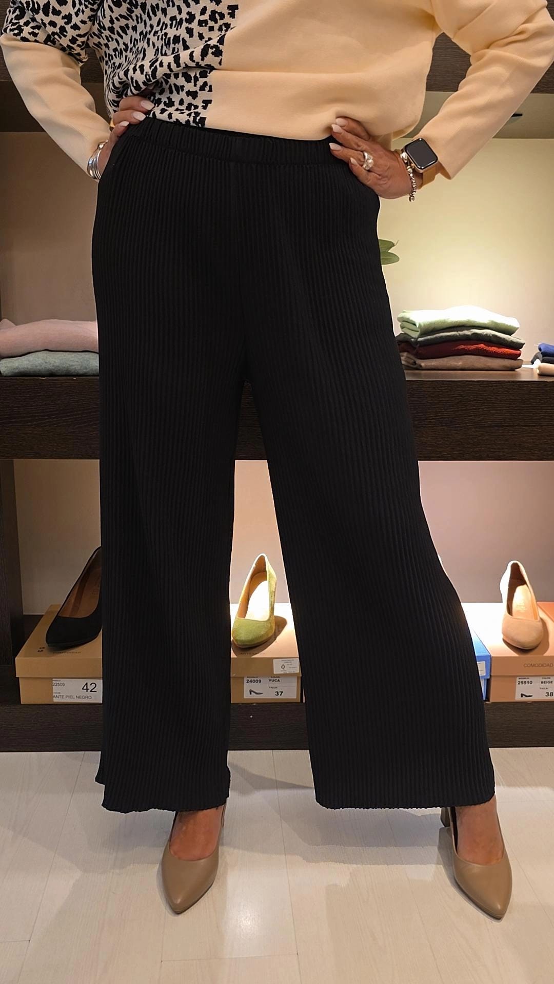Presenta un tejido plisado en vertical que estiliza la figura y aporta un efecto visual elegante y moderno. Su caída es fluida, lo que proporciona comodidad y movimiento al caminar. Es talla única, y da desde una 38-48. Combínalo con el jersey Flor, ideal para cualquier ocasión.