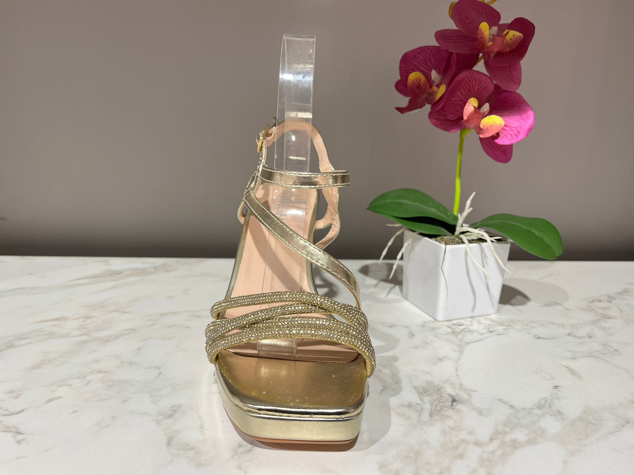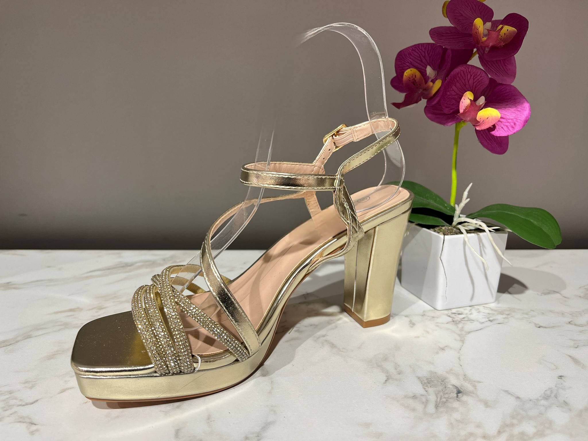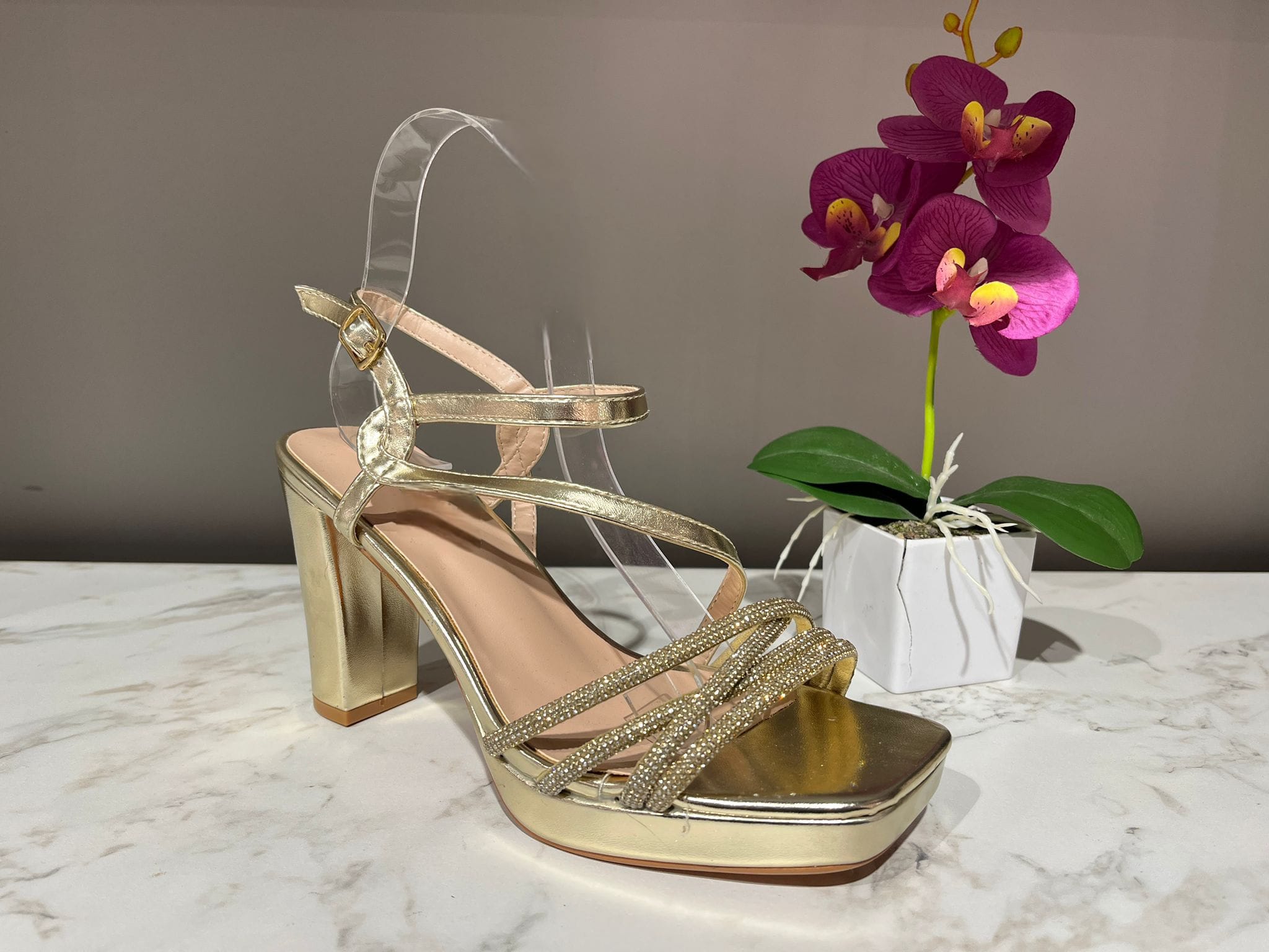 En conjunto, esta sandalia combina a la perfección la elegancia del brillo con la delicadeza de sus líneas, convirtiéndose en una opción perfecta para acompañar vestidos de fiesta, bodas o eventos de noche