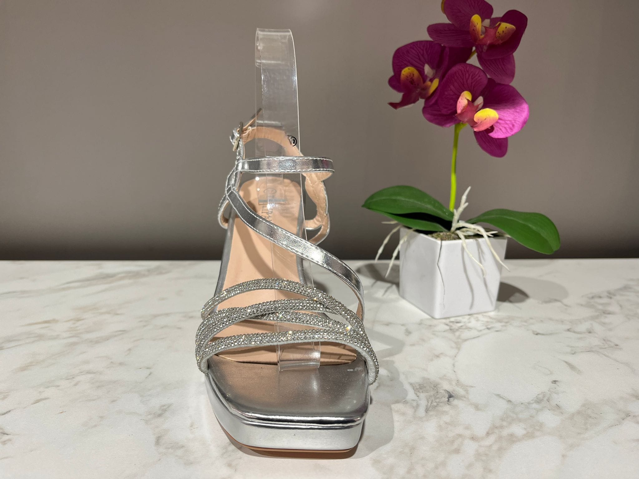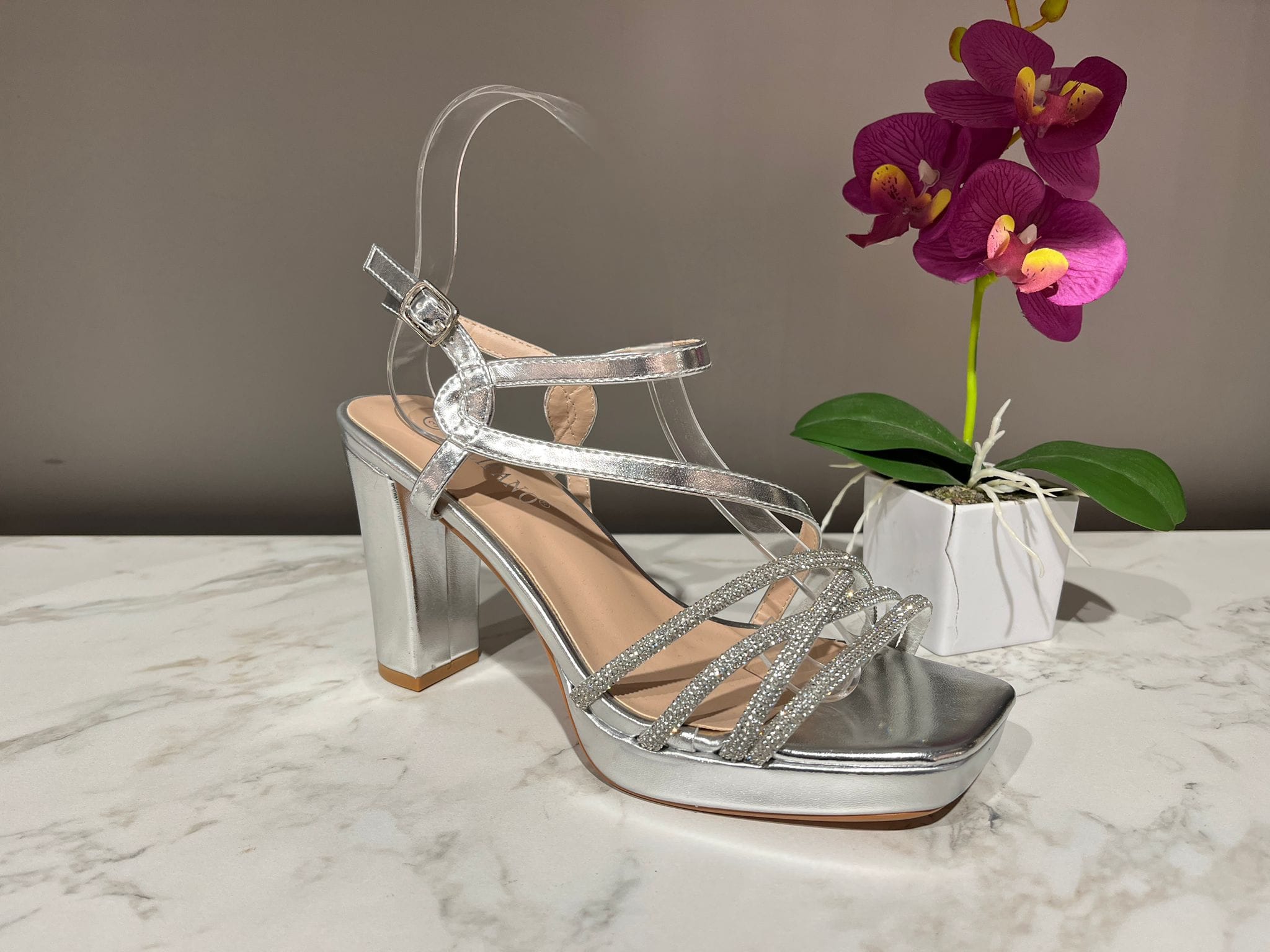 En conjunto, esta sandalia combina a la perfección la elegancia del brillo con la delicadeza de sus líneas, convirtiéndose en una opción perfecta para acompañar vestidos de fiesta, bodas o eventos de noche