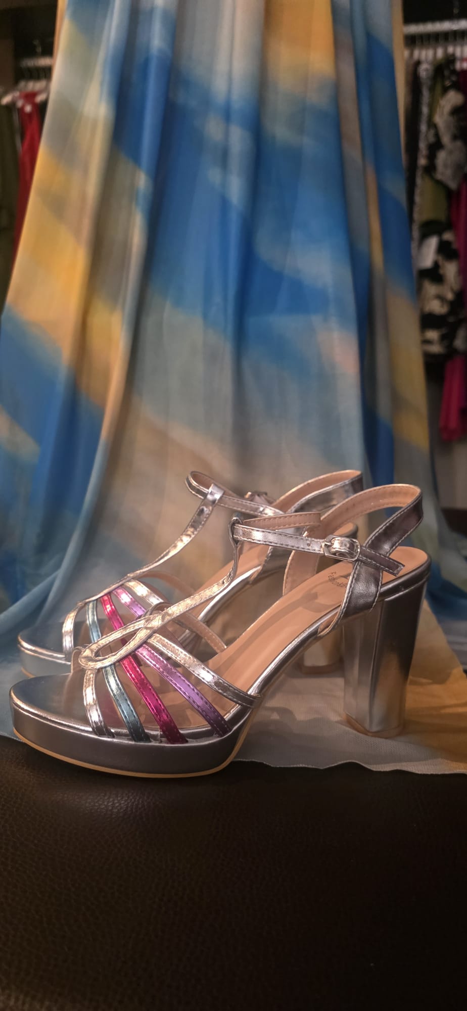 El diseño tipo “T” en la parte frontal estiliza el pie, mientras que las finas tiras decorativas, en diferentes tonos, añaden un contraste delicado y original que rompe con el plata. Además, cuenta con una correa ajustable con hebilla alrededor del tobillo, lo que permite un mejor ajuste y sujeción.