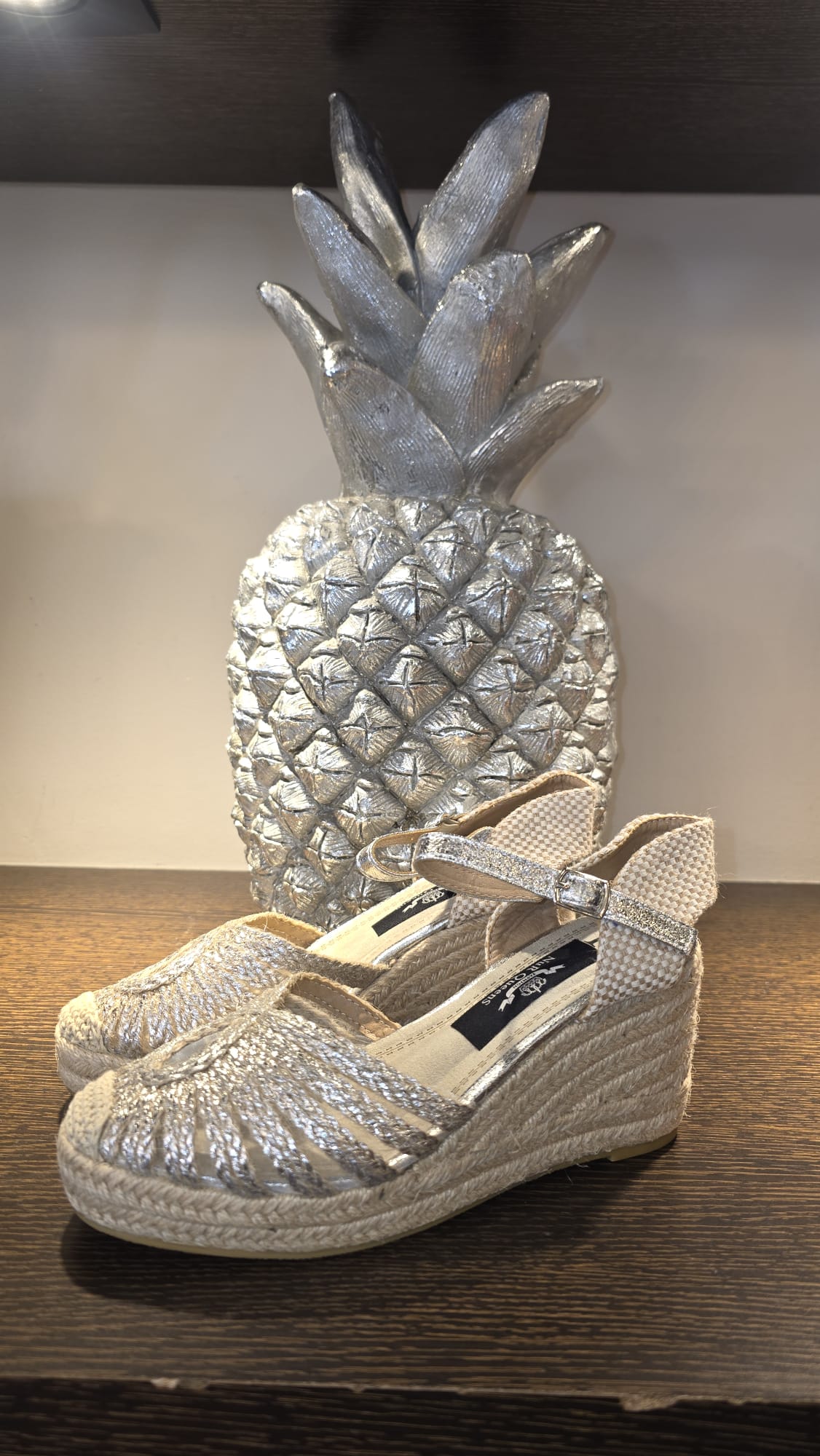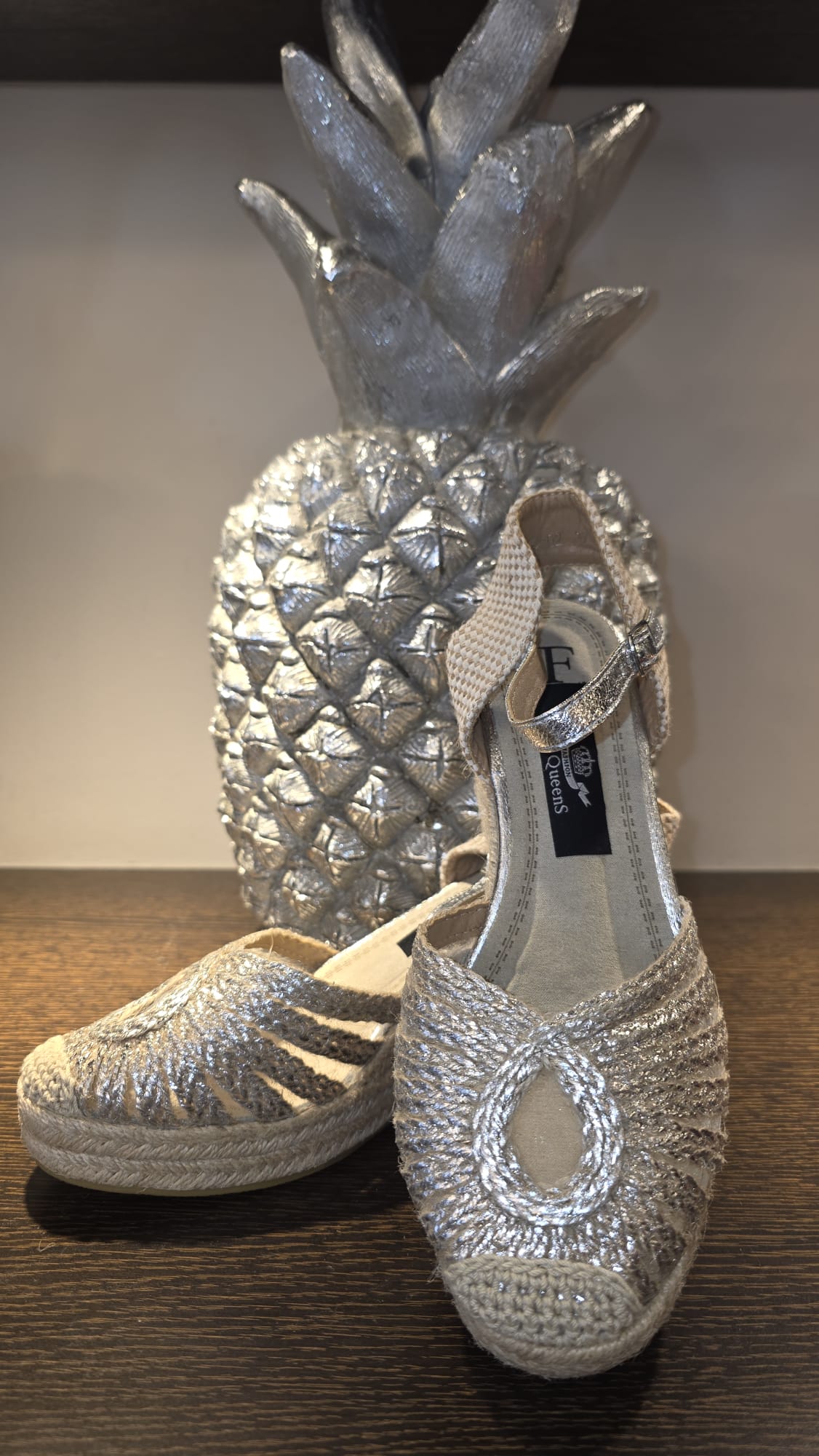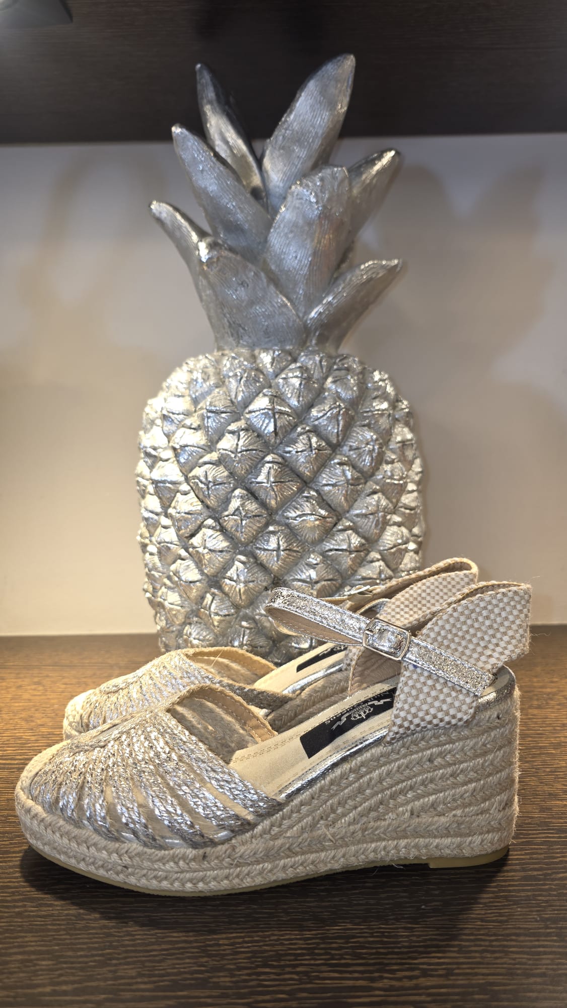 La Sandalia Santorini tipo alpargata con un aire artesanal y elegante. Está confeccionado en tejido trenzado en tono dorado metalizado, lo que le aporta un brillo sutil y muy favorecedor. Presenta una puntera redondeada con acabado en yute, reforzando su estilo veraniego y natural.