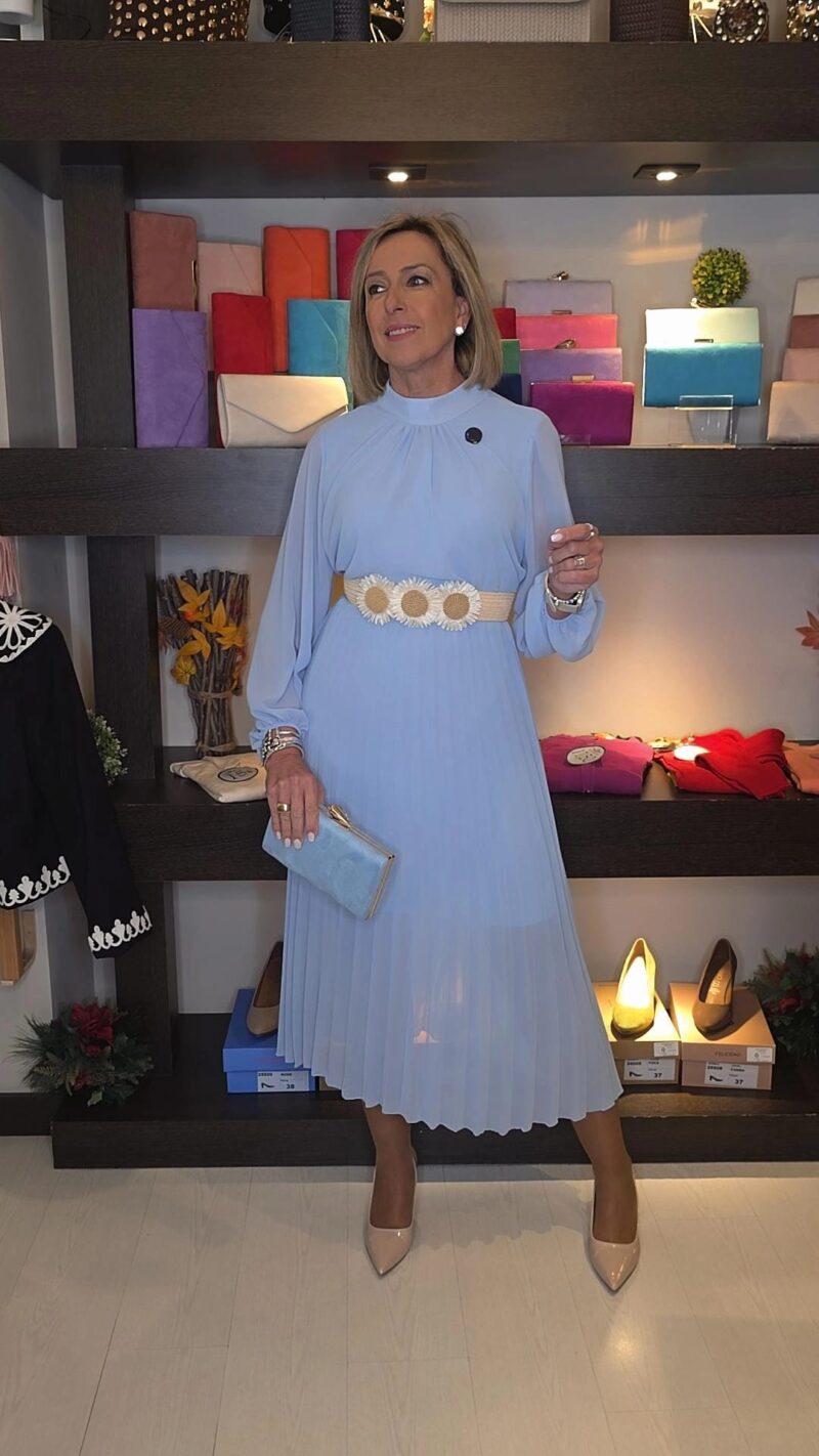 Precioso Vestido Amara de gasita y corte midi con la falda plisada. Es de manda larga terminada en puño para poder arremangarla y dejarla manga francesa. Tiene cierre de botón en la parte del cuello.