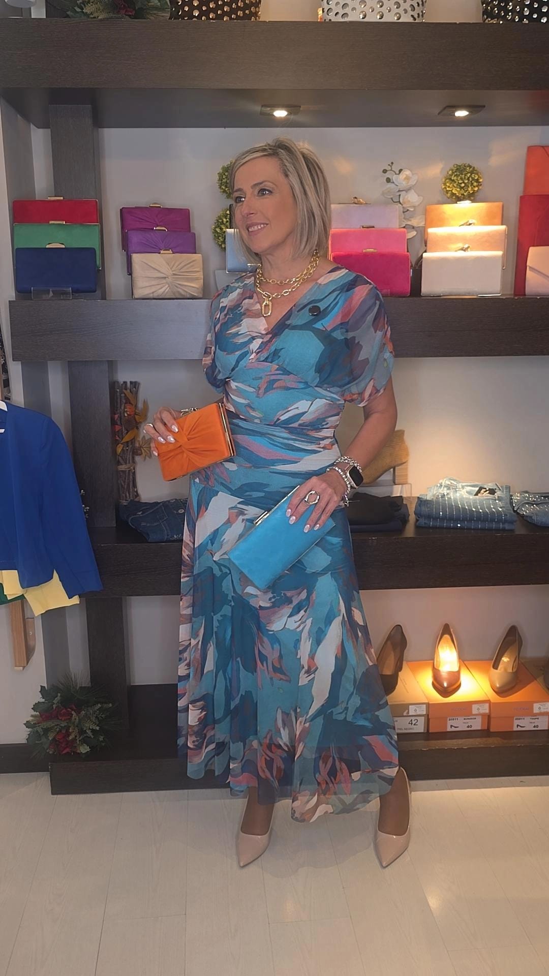 Vestido Cristina de corte midi muy femenino y favorecedor, confeccionado en tejido fluido con caída ligera que acompaña el movimiento. Presenta un elegante escote en pico y manga corta, ideal para estilizar la figura y aportar comodidad en el día a día.