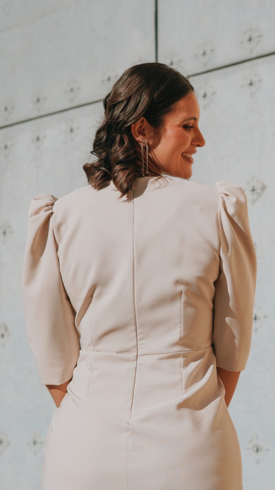 El vestido Diana que aparece en la imagen destaca por su elegancia y sencillez, combinadas con un estilo moderno y muy femenino. El diseño del vestido presenta un escote en forma de “V” cruzado, que realza la parte superior y aporta un toque sofisticado. Las mangas son de largo medio y ligeramente abullonadas en los hombros, lo que añade volumen y un detalle elegante al conjunto.