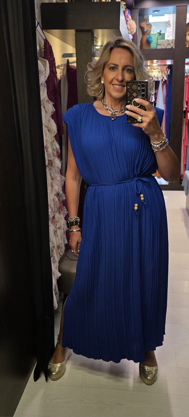 El vestido Francesca destaca por su elegancia y frescura, ideal para un evento tanto de día como de noche. Está confeccionado en un tejido plisado que le da una textura rica y un movimiento fluido al andar, lo que lo hace especialmente favorecedor y cómodo.