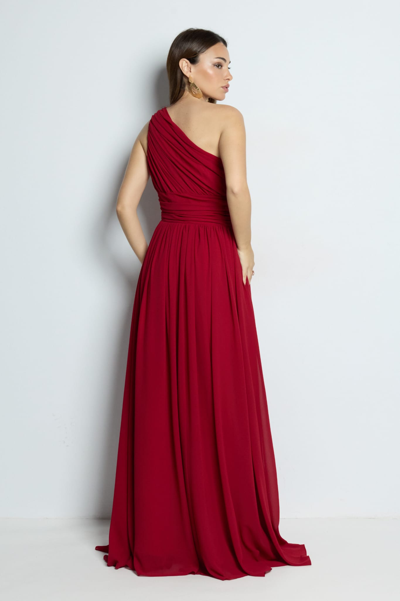 El precioso Vestido Genoveva largo de estilo elegante y muy favorecedor, disponible en varios colores. Diseñado con escote asimétrico de un solo hombro, que aporta un toque sofisticado y moderno. La parte superior presenta un delicado efecto plisado que estiliza el busto, mientras que la cintura fruncida se adapta al cuerpo resaltando la silueta de forma muy femenina.