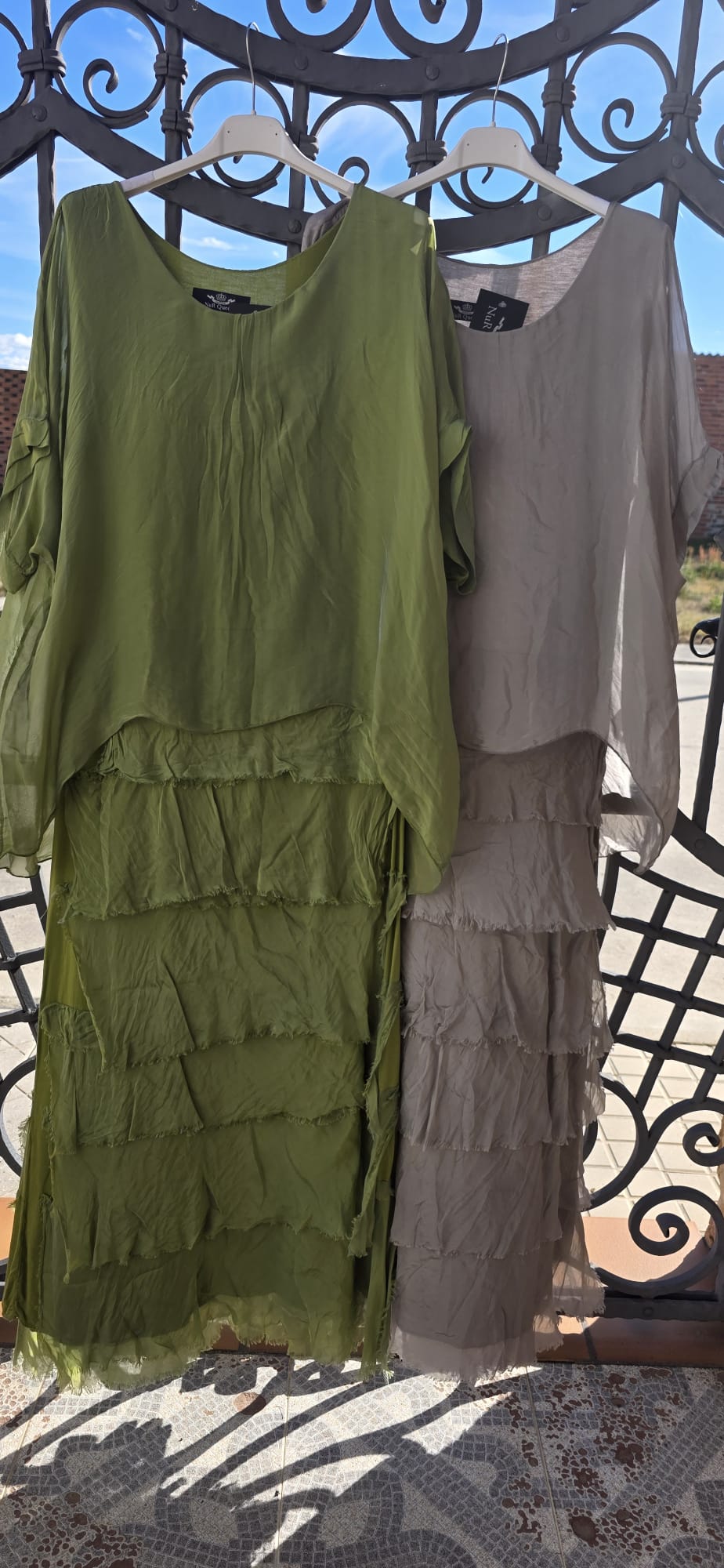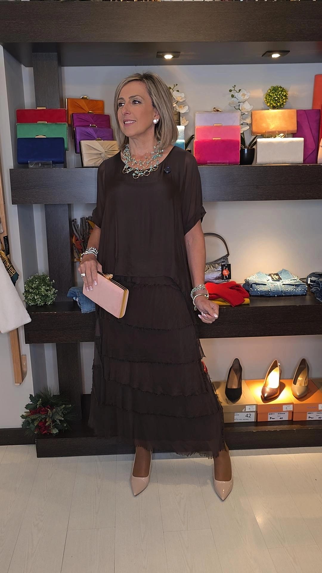 El Vestido Irene de gasa , de corte midi y caída ligera, que destaca por su movimiento fluido y elegante. El diseño presenta un cuerpo suelto con manga corta, aportando comodidad y un aire sofisticado sin esfuerzo.