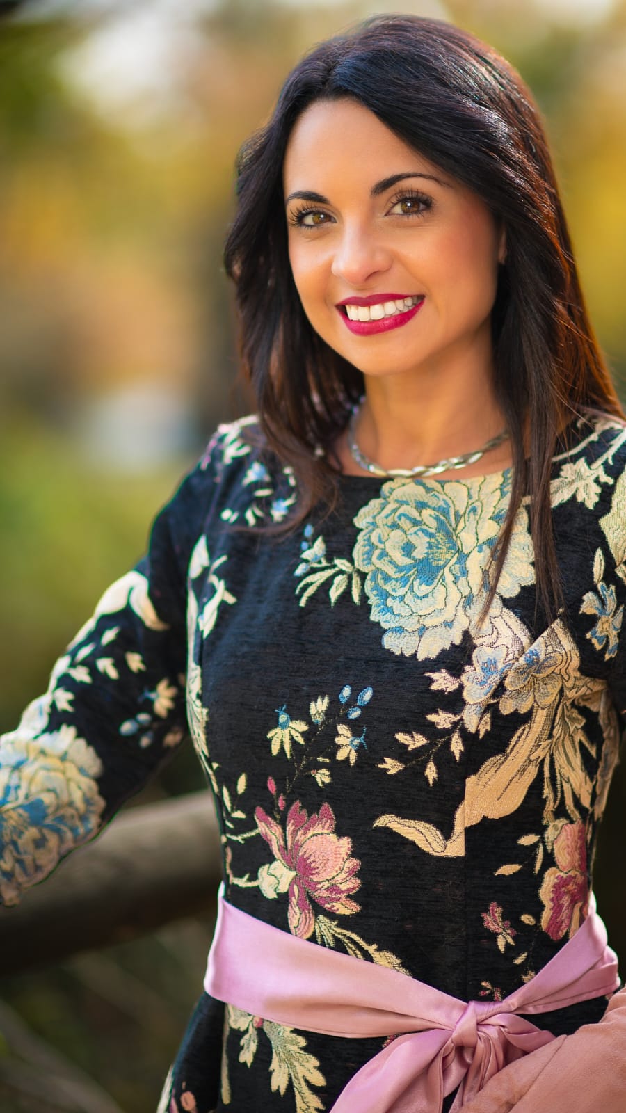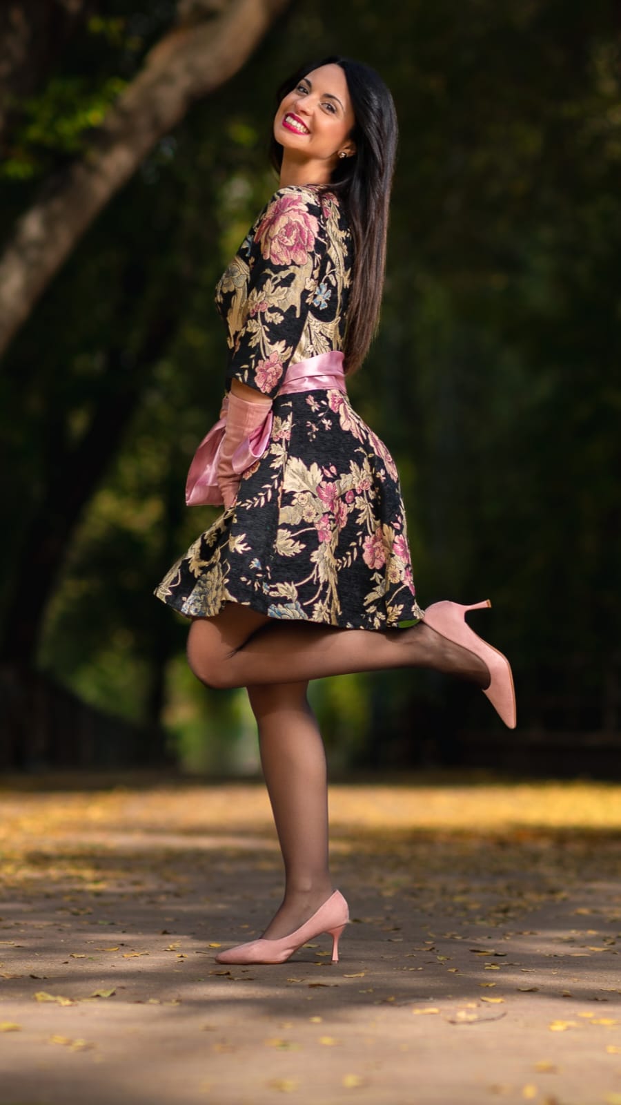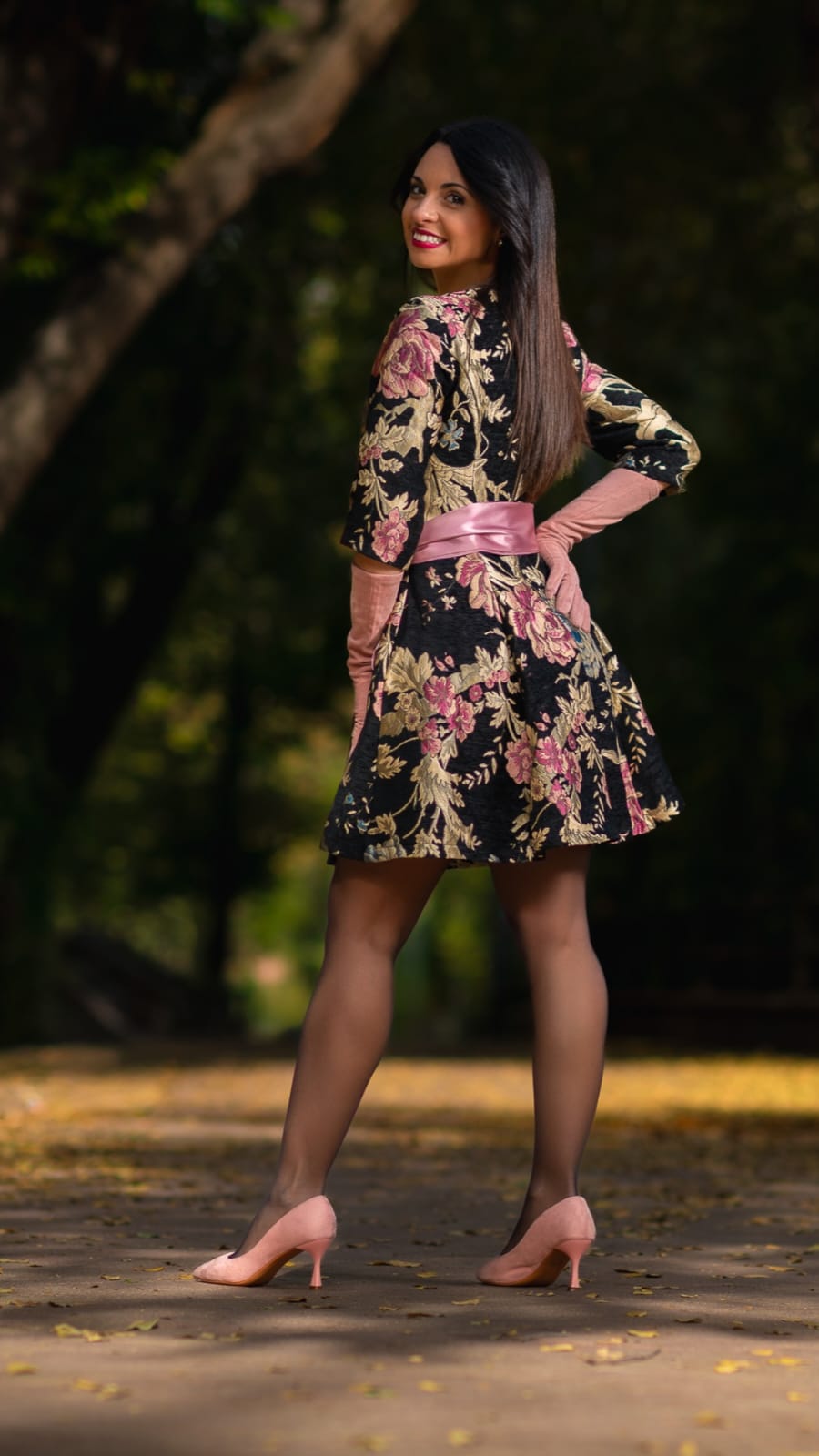 Luce un estampado floral exuberante en tonos rosas, azules y dorados y verdes, lo que crea un contraste sofisticado y muy favorecedor.