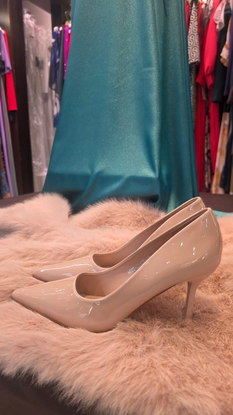 El zapato charol es un elegante salón de tacón de unos 8 cm, confeccionado en charol color nude. Su diseño es clásico y sofisticado, con una punta afilada que alarga visualmente el pie y estiliza la figura. El acabado brillante del material le aporta un toque refinado y versátil, perfecto tanto para un look de oficina como para un evento especial.